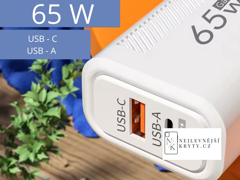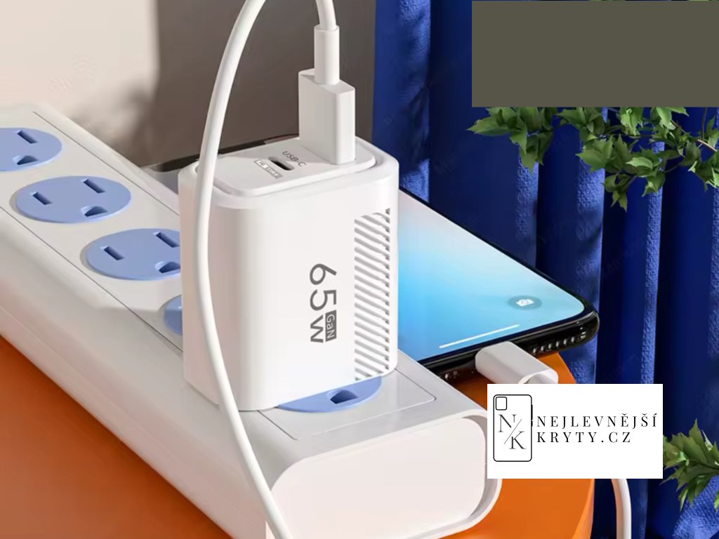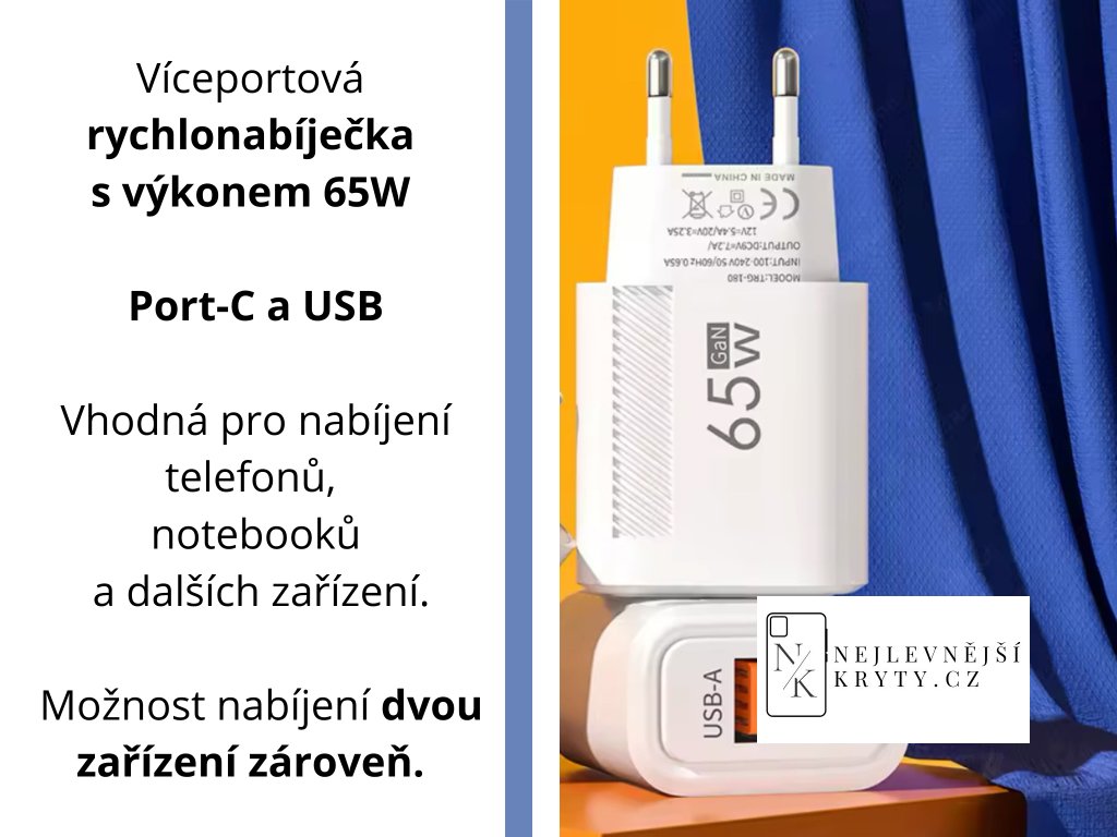 Víceportová rychlonabíječka s výkonem 65W a podporou PowerDelivery a Quick Charge. Port-C a USB - Vhodná pro nabíjení telefonů, notebooků a dalších zařízení. Rekordní čas nabití telefonu, či jiného zařízení. Možnost nabíjení dvou zařízení zároveň.